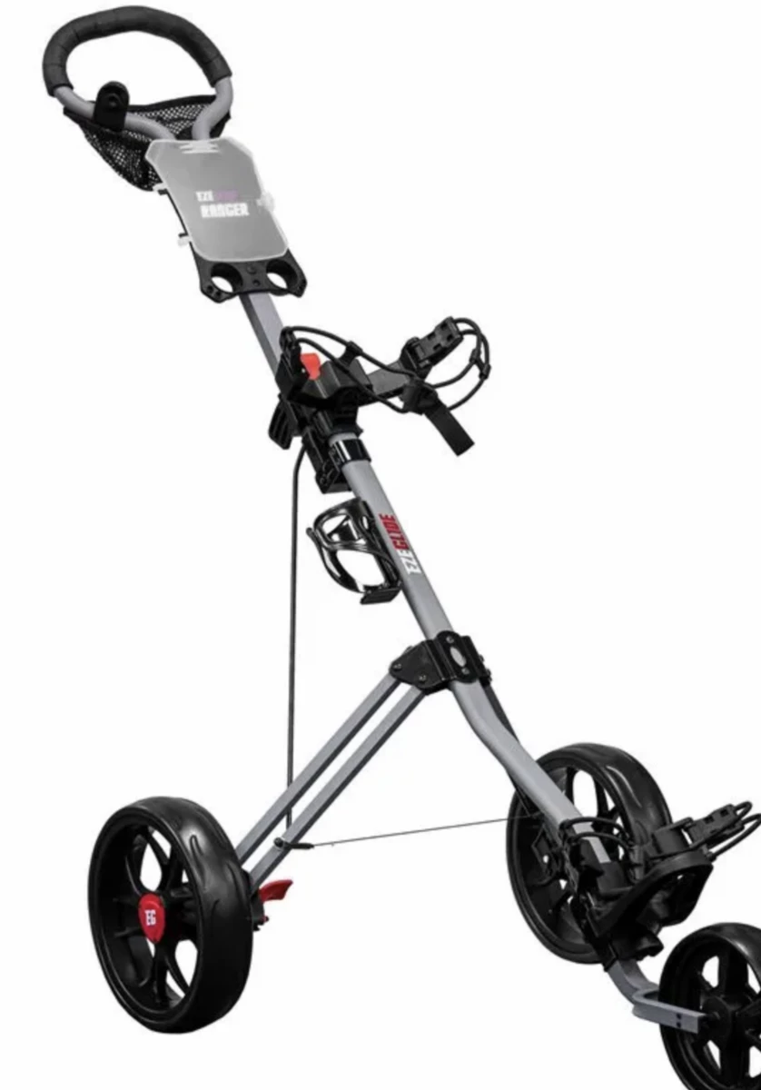 EzeGlide Ranger 3 wheel trolley is great value 3 wheel trolley with a range of features and a lightweight sturdy frame construction. A quick-fold mechanism enables the trolley to be folded flat in seconds. Includes scorecard holder with ball storage space , a mesh storage compartment for other accessories and drinks holder is included. Elasticated Bag Strap On The Top And Bottom. Wide wheelbase ensures optimum stability and easy manoeuvrability. Quick-release side wheels for ease of storage. Some Other features include a click on, click off footbrake.